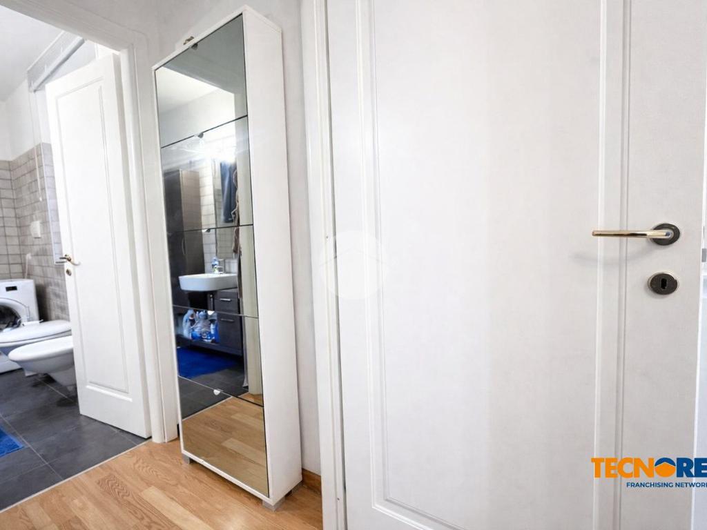 Tramite il portone d'ingresso si accese al zona giorno composta da angolo cottura e soggiorno, dotata di balcone. Tramite un comodo disimpegno, utilizzabile anche come ripostiglio, abbiamo accesso al bagno finestrato dotato di box doccia e zona lavanderia e una spaziosa camera da letto matrimoniale anch'essa dotata di balcone.